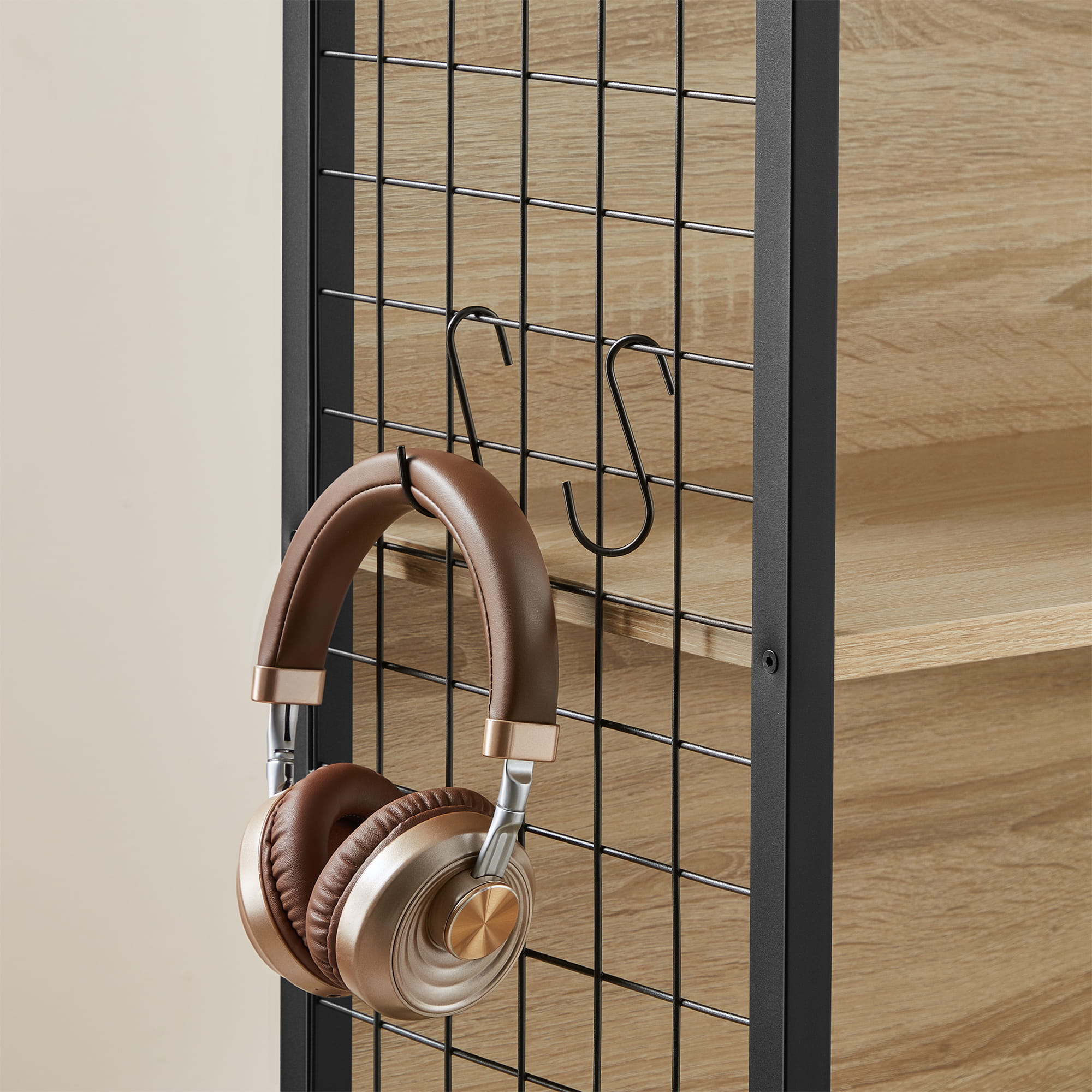 Na bocznych kratkach mebla można zawiesić 4 haki w kształcie litery S, które pozwolą na zawieszenie na regale przedmiotów, które chcemy mieć pod ręką, np. słuchawki.