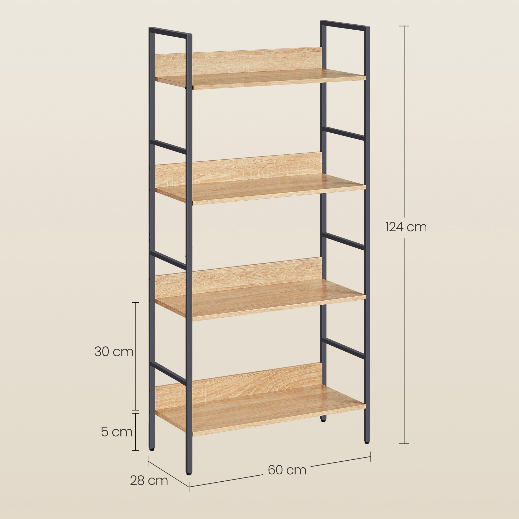 • Regał cechuje się uniwersalnością oraz funkcjonalnością, będzie świetnie pasował do salonu, sypialni, przedpokoju, domowego gabinetu, a 4 półki ułatwią nam dostęp do ulubionych rzeczy.